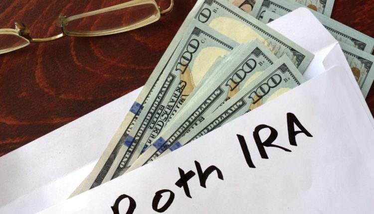 An envelope with the Roth IRA inscription with protruding hundred-dollar bills.