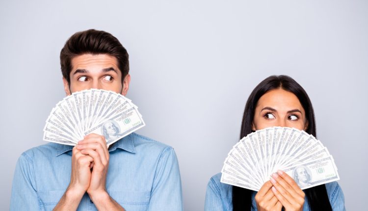 A man and a woman hold fans of $ 100 bills.